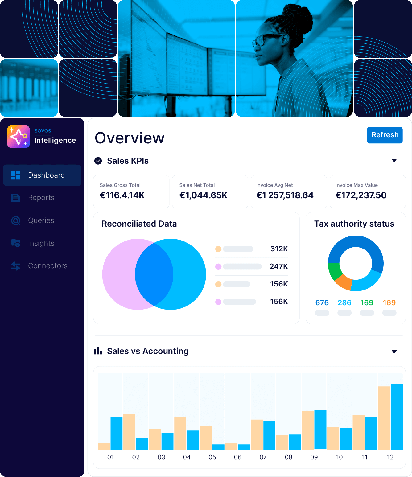 By leveraging the same real-time dataSovos Intelligence transforms how businesses leverage their own data in the new era of real-time tax compliance. It unifies fragmented e-invoicing, tax, and accounting data from across your systems into a single source of truth, our solution, powered by Sovi AI, converts a reactive obligation into into a proactive strategic advantage.